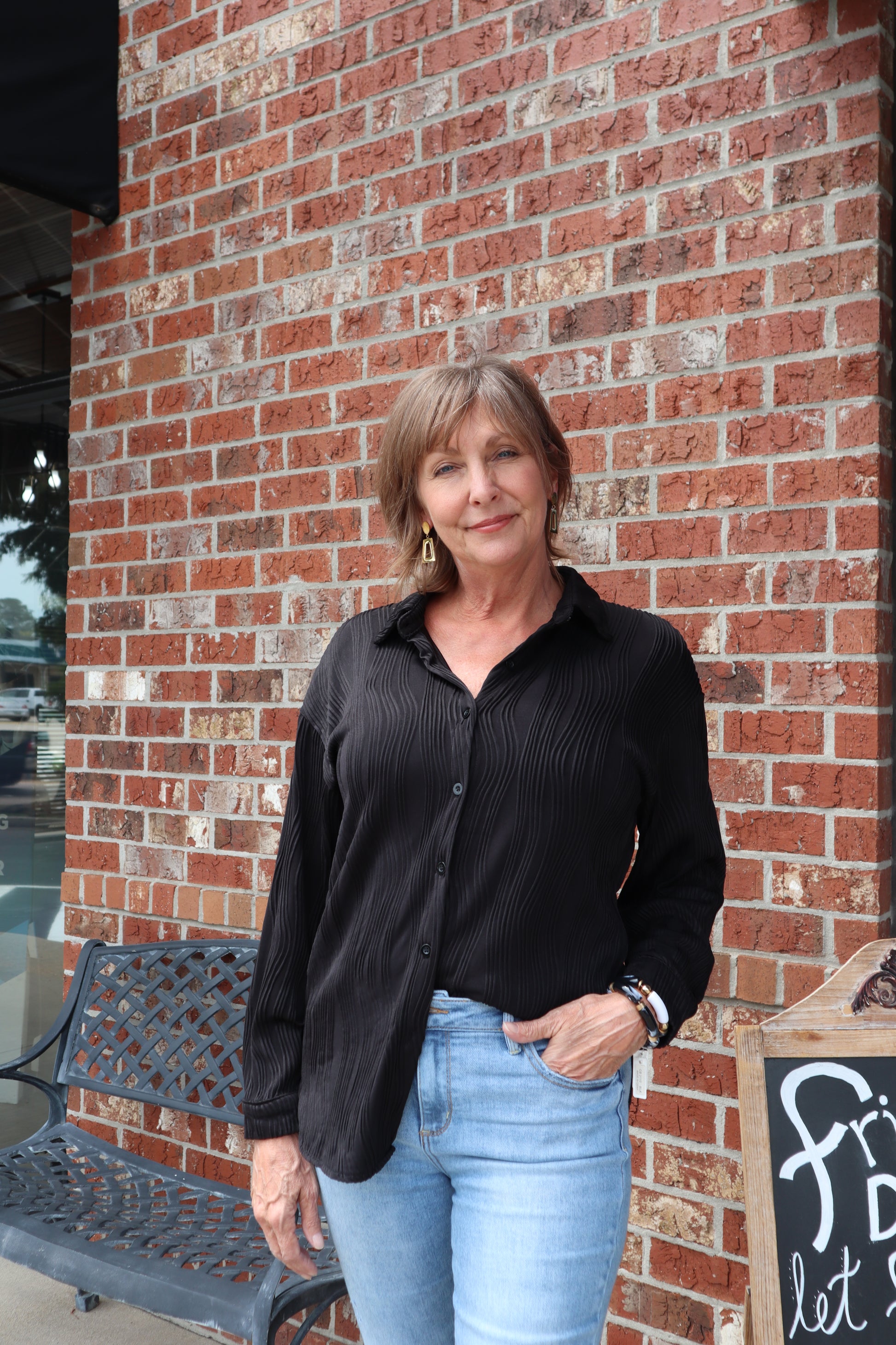 The Elegant Ease Blouse in black brings effortless charm with its playful wave details and classic button-down front. Its long sleeves add a touch of sophistication while keeping you comfortable all day. Perfect for mixing elegance with a fun twist!